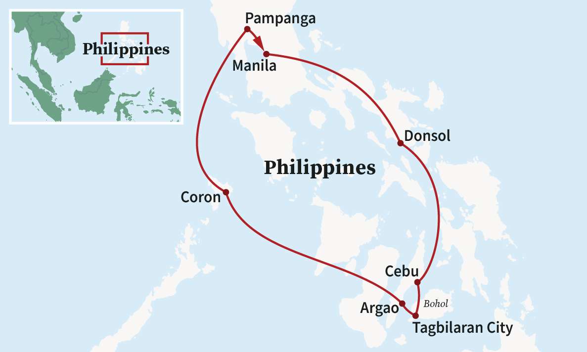 Swim with gentle whale sharks in Donsol, see the Chocolate Hills of Cebu, experience the thrill of the Moalboal sardine run, and explore hidden lagoons and snorkel among shipwrecks in Coron. On this journey, we get to snorkel dazzling reefs, stroll along white-sand beaches, hike among towering limestone cliffs and turquoise-blue lagoons, and take in the warm and welcoming Filipino culture.